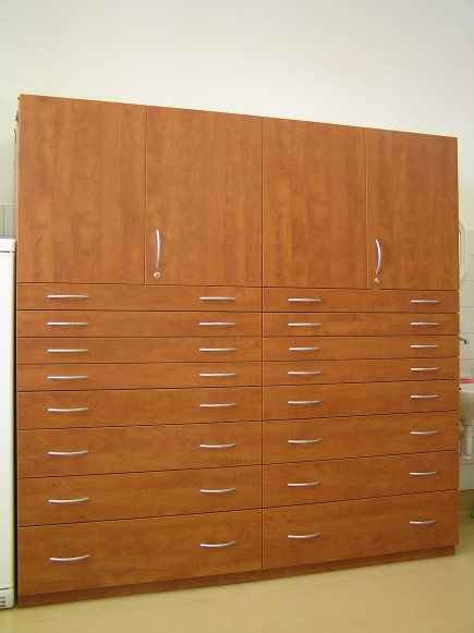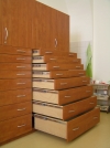 Sestava skříní je určena jako lékárnická a kartotéková. Komfortní využití celého prostoru šuplíků zajišťuje plněvysouvací mechanismus.